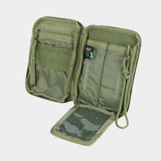 En el interior, cuenta con una sección con cintas elásticas para bolígrafos, barras luminosas (chemlights), etc. En esta misma sección incluye una tira para sujetar un mosquetón o llaves. En la otra sección, dispone de dos compartimentos más grandes para una multiherramienta, una pequeña linterna, etc.
