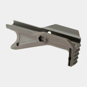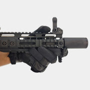 La parte frontal incorpora una superficie estriada que permite apoyar el arma contra superficies (paredes, barricadas, mesas) mejorando la estabilidad durante el tiro. La sección trasera funciona como hand stop, ofreciendo control sin añadir volumen innecesario.