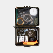 El peso total del kit de supervivencia es de 168 gramos y contiene: navaja pequeña, silbato, sierra de cable, cable, kit de pesca, algodón, vela, brújula pequeña, kit de costura, imperdibles, kit de iniciación de fuego, espejo de supervivencia y lápiz.