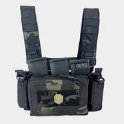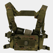 Dispone de espacio para portar 3 cargadores de rifle en la parte frontal y 2 de pistola en los elásticos laterales, además cuenta con un pouch frontal para portar más accesorios.
