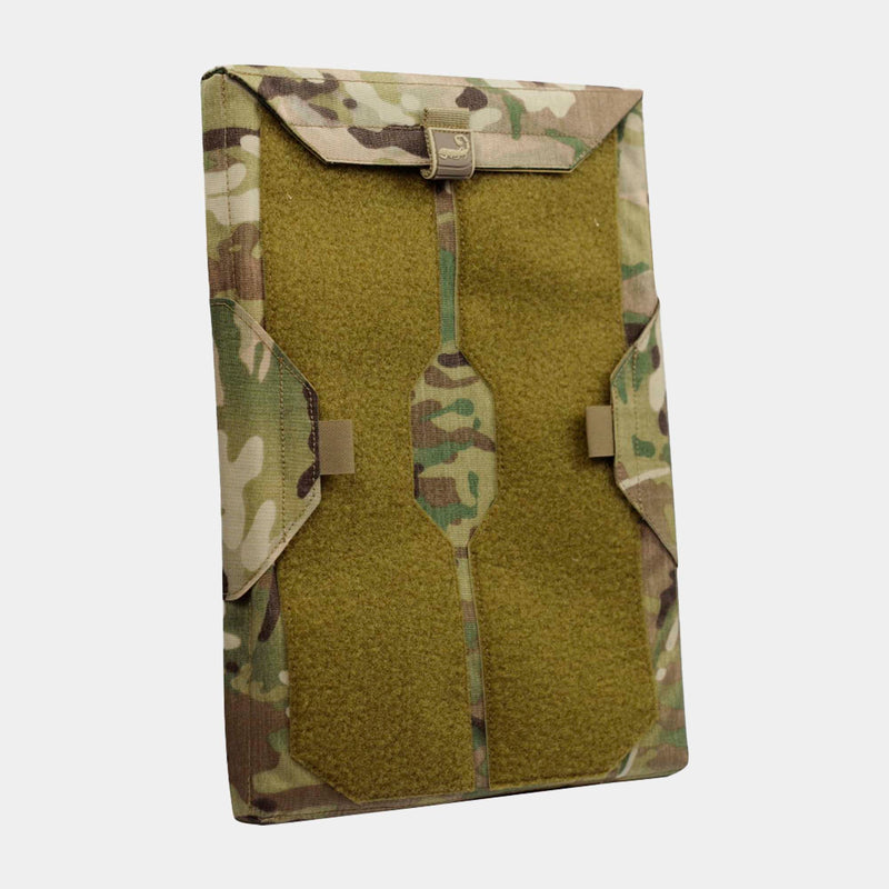 El diseño exterior de esta funda incluye velcro en la parte frontal para anclarle accesorios adicionales, parches, etc. La parte trasera es completamente lisa, en los laterales tiene dos especies de "alas" que en las fotografías se ven ancladas al velcro delantero, estas alas se pueden voltear para anclar la funda en una superficie de velcro, como la que tienen algunas mochilas en la parte interior, como la mochila AMAP III.