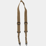 Cinghia tattica porta fucile a due punti Coyote del marchio MILTEC. Dispone di un moschettone metallico che permette di ancorare l'arma da due supporti. Uso sia per persone destre che mancine, inoltre ha un design elastico.