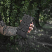 La funda para smartphone Elite Large Hexde la marca ucraniana M-TAC está fabricada en materiales de primera calidad, como Cordura 500D y Cordura Hex 1000D, además, cuenta con una hebilla imantada de la marca Woojin que asegura que el teléfono no se caida de manera accidental.
