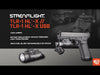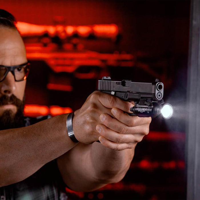 Incluye dos tipos de palancas traseras ("High" y "Extended High") para adaptarse a distintos estilos de disparo. Ensamblada en EE. UU., incorpora una tapa frontal abatible con controles de liberación robustos para facilitar el cambio de baterías sin desmontar la linterna del arma.