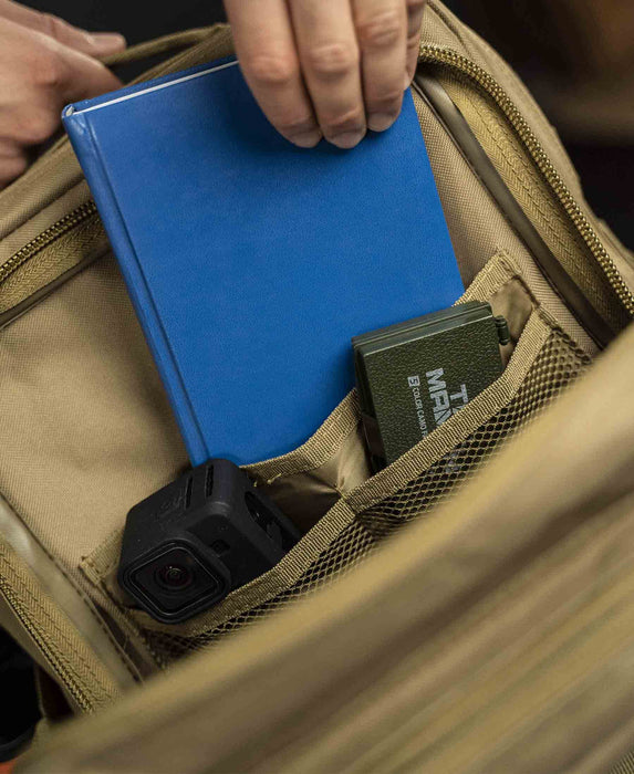 Dispone de sistema MOLLE con cintas 420HB en el frontal y los laterales, permitiendo anclar fácilmente accesorios adicionales como portabotellas, botiquines, bolsillos modulares, entre otros.