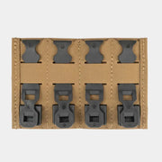 Está fabricado en Cordura de alta resistencia junto con los famosos insertos KYWI de Kydex estos están fijados mediante velcro al inerior del cargador. Gracias a esta construcción la boca del portacargador se mantiene abierta y mejora la retención sin necesidad de añadir ningún accesorio adicional. En la parte trasera cuenta con plataforma MOLLE que es compatible con one wrap velcro, adaptadores molle WTFix o clips MALICE (incluidos), lo que permite una fijación firme sobre chalecos, cinturones o paneles compatibles. Además, dispone de orificios de drenaje para favorecer la evacuación de agua o suciedad. No es compatible con cargadores tipo AK.
