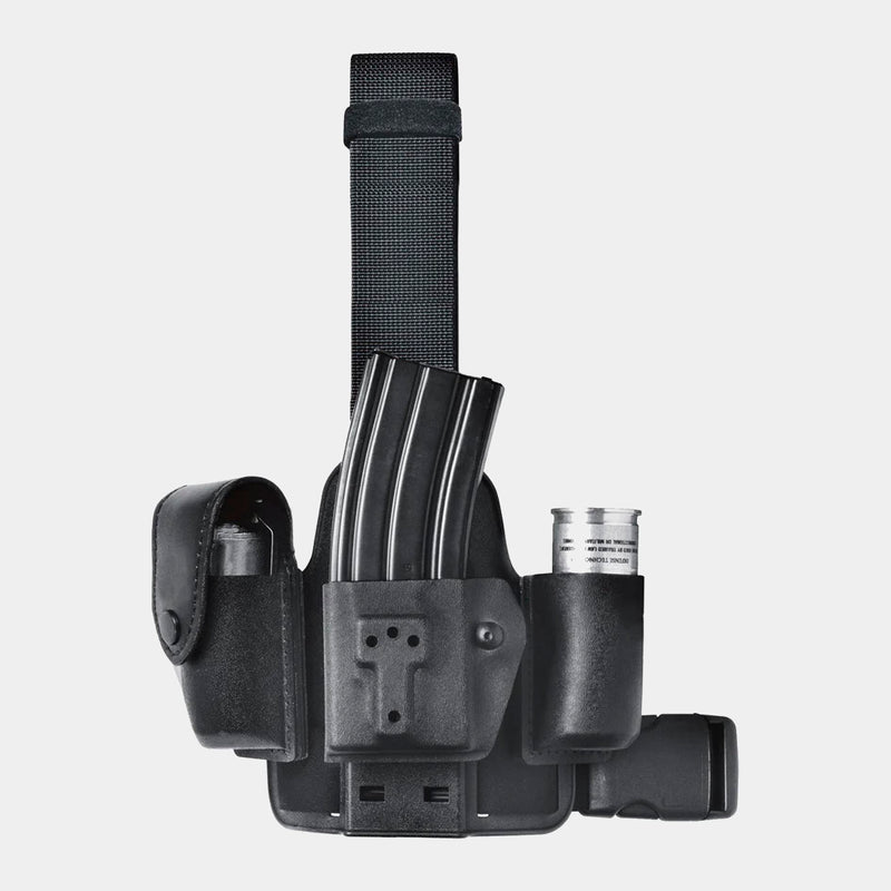 Esta pernera táctica 6009-10 Single Strap Leg Shroud With D-Ring da marca americana Safariland é uma pernera que é composta por uma tira de 2" (50mm) elástica e uma anilha D-Ring com uma tira de 2" (50mm) que se ancla ao nosso cinto de serviço. Não nos incomodará ao estar sentado graças à sua anilha D-Ring que gira quando nos sentamos.