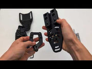É compatível com qualquer coldre da Safariland, o kit inclui: 3 parafusos de 1", 2 espaçadores (um mais largo e outro mais fino). Podemos montar o coldre com um ou os dois espaçadores, dependendo da nossa preferência.