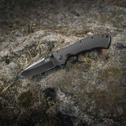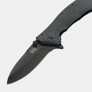 El manga combina uma estrutura de aço com uma escala de G10, um material resistente e antiderrapante que melhora a aderência mesmo com luvas ou mãos molhadas. O sistema de bloqueio tipo fecho de moldura proporciona segurança durante o uso, evitando fechamentos acidentais.