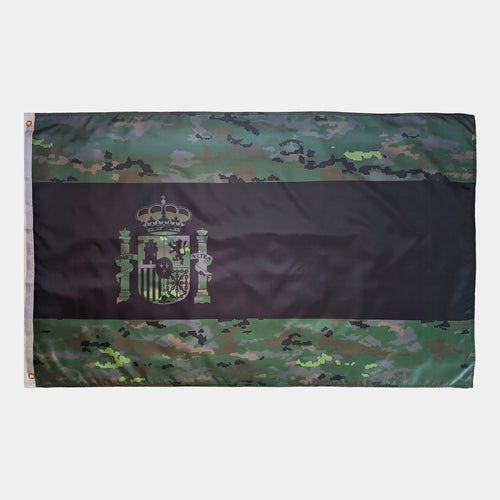 Flagge von Spanien im pixelierten Wüstentarnmuster, dieses Tarnmuster wird von der Landarmee, der Marineinfanterie und der Luftwaffe Spaniens verwendet. Es verfügt über zwei Löcher für die Flaggenleinen des Mastes.