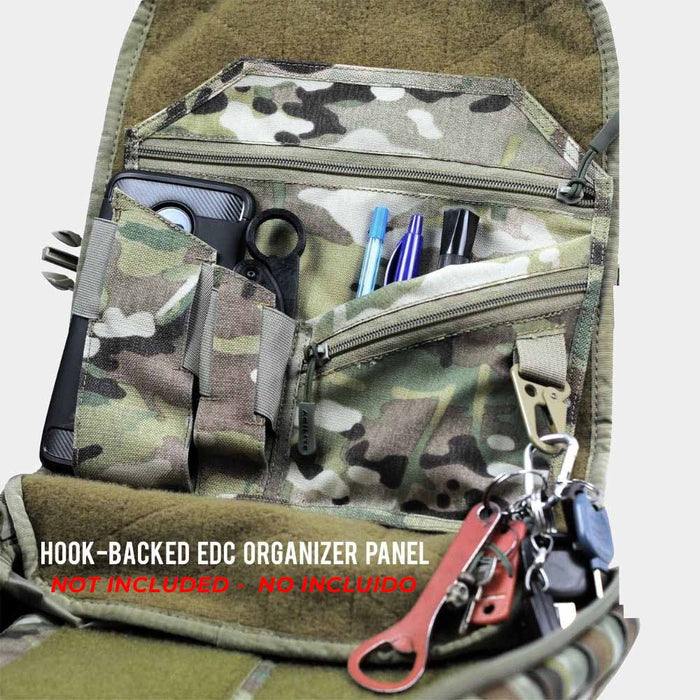 The central pocket opens completely 180º, on the inside we find the front and back wall covered with Velcro® that facilitates the anchoring of additional accessories, such as an EDC panel, CCW holster, etc., on the right side we find several elastic compartments to store multitools, flashlight or other similarly sized objects.