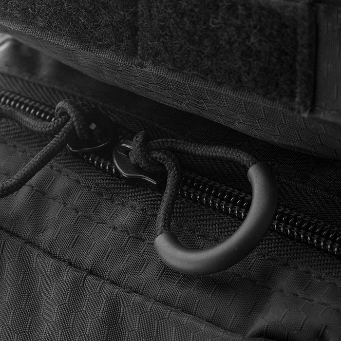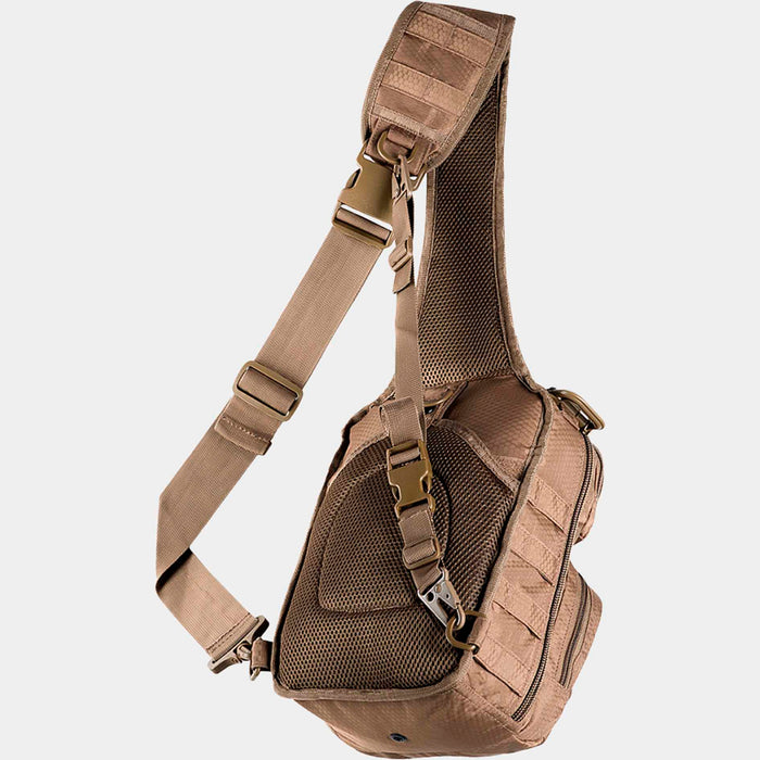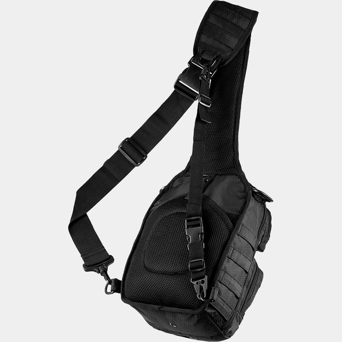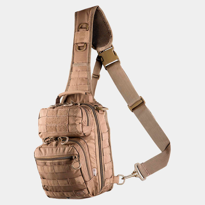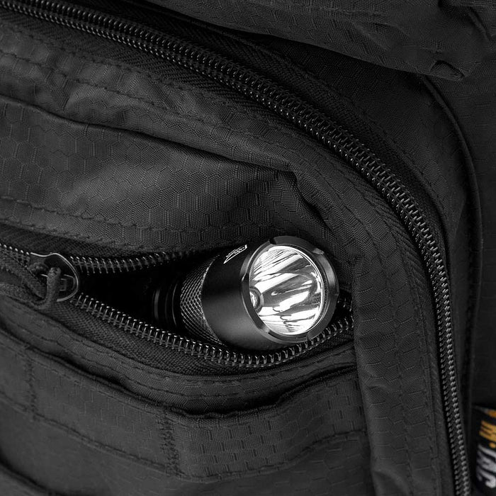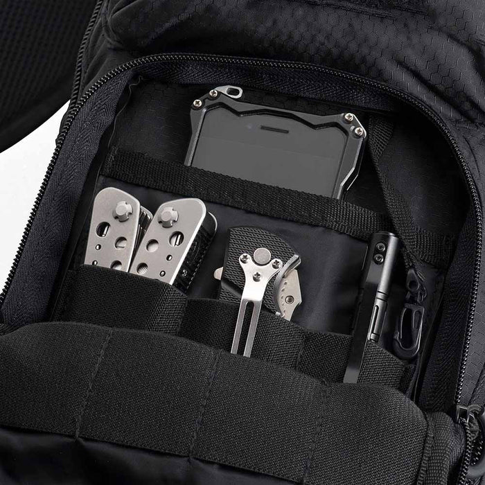 The single-strap backpack features four compartments: a small pocket on the front that we can use to store small objects like identity cards, keys, etc., a second compartment with greater capacity with a organizer inside to carry flashlights, mobile phones, multitools, etc., in an organized manner, another small compartment on the top, where we find a velcro panel. Finally, it has a main compartment in which we can carry the rest of the items that do not fit in the smaller compartments.