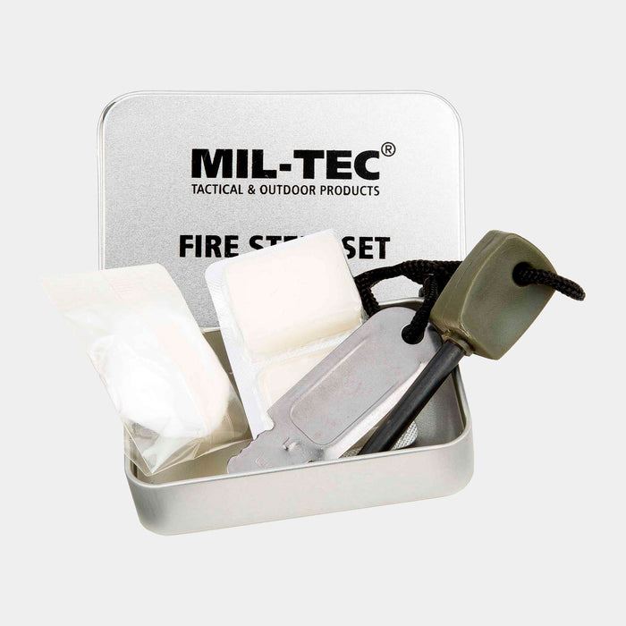 This emergency fire starting kit from the German brand MIL-TEC is a fire starter that includes: flint with ferrocerium (spark initiator), two fuel tablets and a piece of cotton.