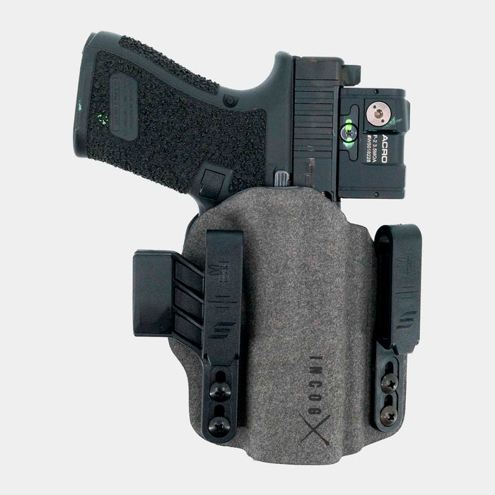 It has a passive retention system (PRD), which can be adjusted by tightening or loosening the screw with the red washer. The INCOG X holster is made with a Boltaron® shell and covered with a layer of microfiber suede that prevents excessive sweating.