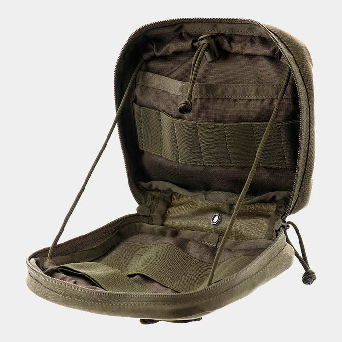 This molle pocket is divided into 2 compartments, the smallest one is at the front which will serve to store small items like identification cards, a key, etc., the second compartment has a opening angle of up to 90º, this is adjustable through the two paracord strings on the sides that act as "hinges", inside we find a organizer with a multitude of elastic hooks that will allow us to store pens, knives, multi-tools, flashlights, etc., it also has an empty compartment at the back that we can use to store larger items, such as notebooks, maps, etc.