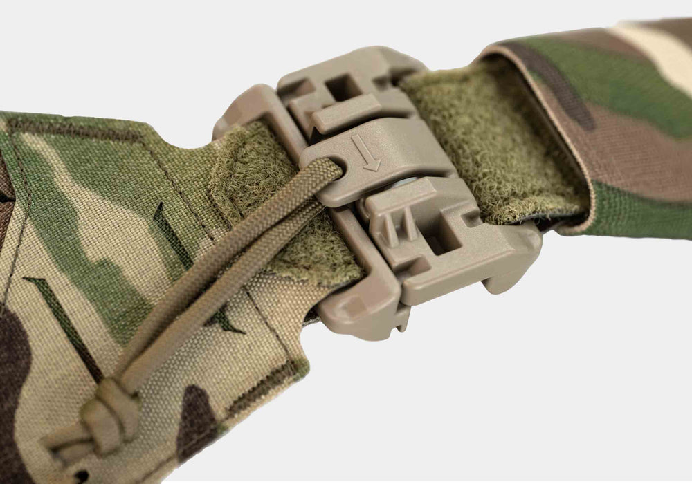 The cummerbunds sides are made with a core of 3" Tegris®, which provides them with rigidity and lightness. At the front, they are anchored to the vest by velcro and a quick-release buckle, while at the back they have an elastic section to provide greater freedom of movement.