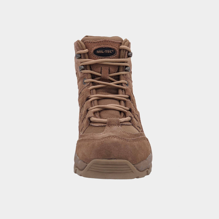 Squad boots in Coyote color from the MILTEC brand, are mid-calf boots made from a mix of leather and polyester. They are lightweight and durable boots, with a high-quality EVA rubber midsole.