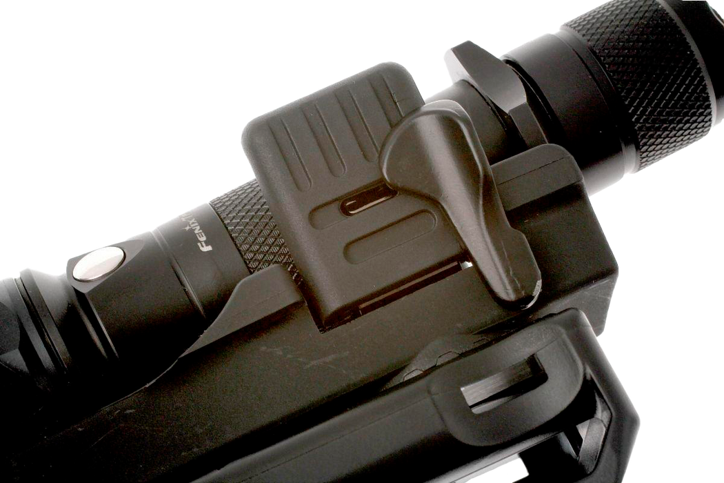 Once placed in its position, the cover has a safety lock to prevent the flashlight from accidentally falling. Both the removal of the flashlight and the assembly are done from a side position, unlike traditional cases which are done from above, making it more ergonomic and versatile.