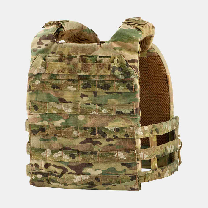 En la parte interior, el portaplacas dispone de rejilla 3D que favorece la circulación del aire. Las correas de los hombros cuentan con un diseño ergonómico que respeta el contorno del cuerpo, las fajas laterales reducen significativamente el peso y además nos permite anclar bolsos molle, etc.