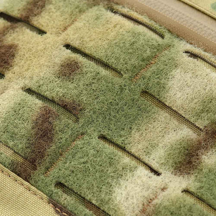 En la parte frontal, el portaplacas cuenta con una zona de velcro y molle para poder anclar diferentes accesorios. En la parte superior, cuenta con un pequeño compartimento con cremallera AquaGuard resistente al agua, este pequeño compartimento es perfecto para portar objetos importantes como IDs, llaves, etc.