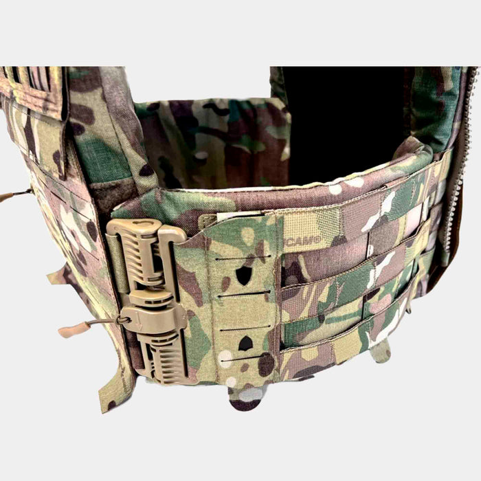 Este chaleco portaplacas, en la parte frontal superior tiene una malla reforzada con un compuesto de fibras llamado Curv® que nos ofrece una gran resistencia y durabilidad. Esta malla ofrece una mayor estabilidad que un panel molle tradicional, ya que el composite Curv® es más rígido y no se doble tan facilmente como la Cordura®.