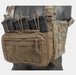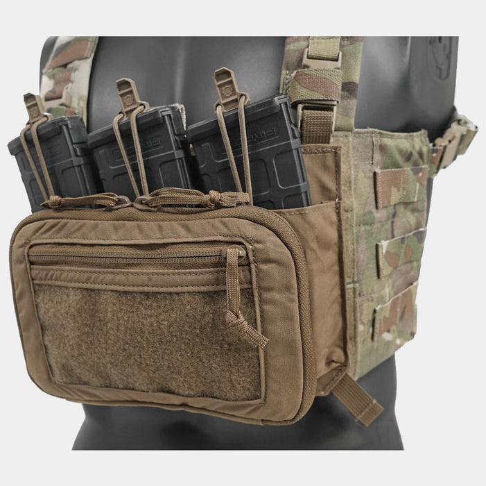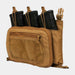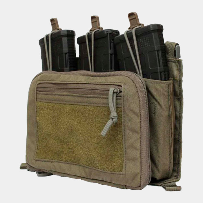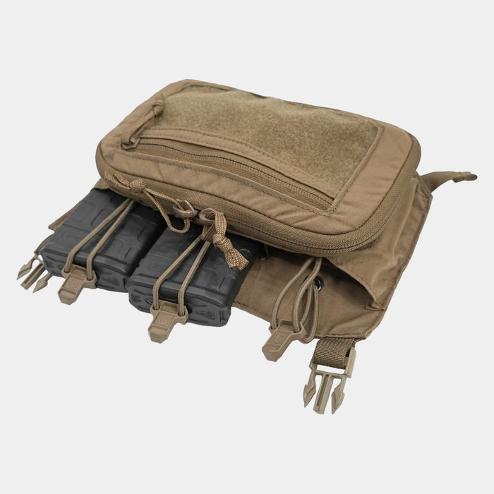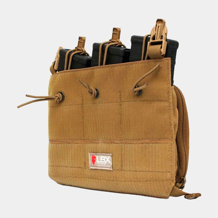 Su diseño incorpora aparte de 3 portacargadores de fusil 5.56mm (M4/M16/AR15/HK416 y AK) con retención superior mediante cuerda elástica, un bolsillo tipo admin con 3 cintas elásticas en la parte interior para poder portar cargador de arma corta, linterna, spray de defensa, etc., y el resto del interior está recubierto de velcro hembra que facilita la fijación de accesorios adicionales. Este bolsillo tiene unas dimensiones aproximadas de 15×22,5×4cm (8W x 6H)