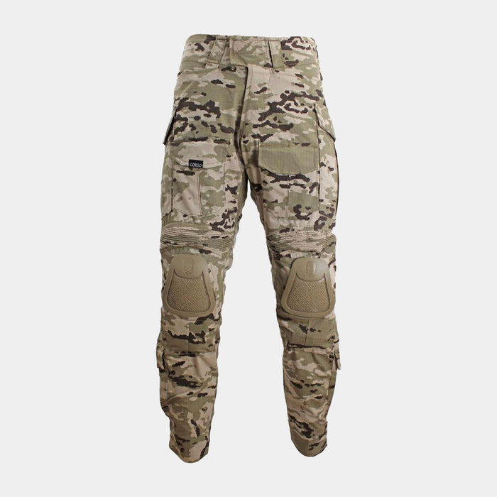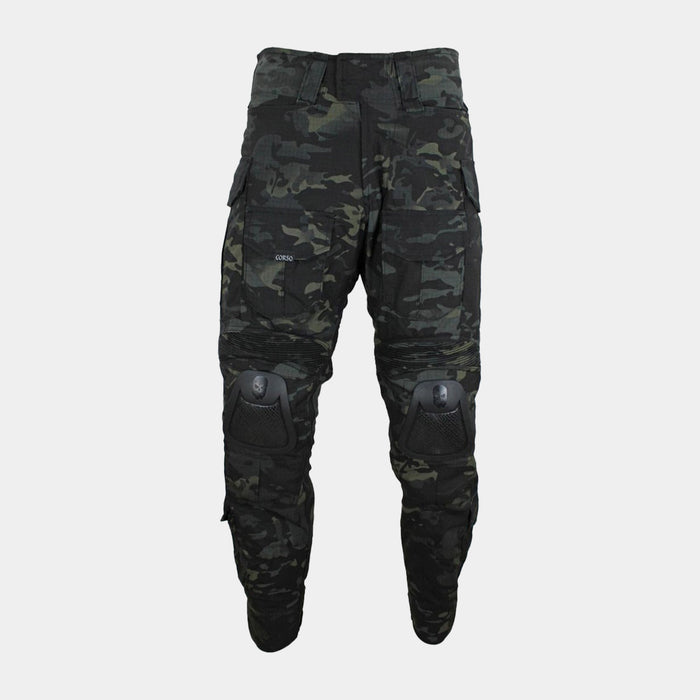 El pantalón táctico de combate Blackbeard de la marca española Corso está fabricado en poliéster, con refuerzos en las rodillas y zonas elásticas para una libertad de movimientos total.