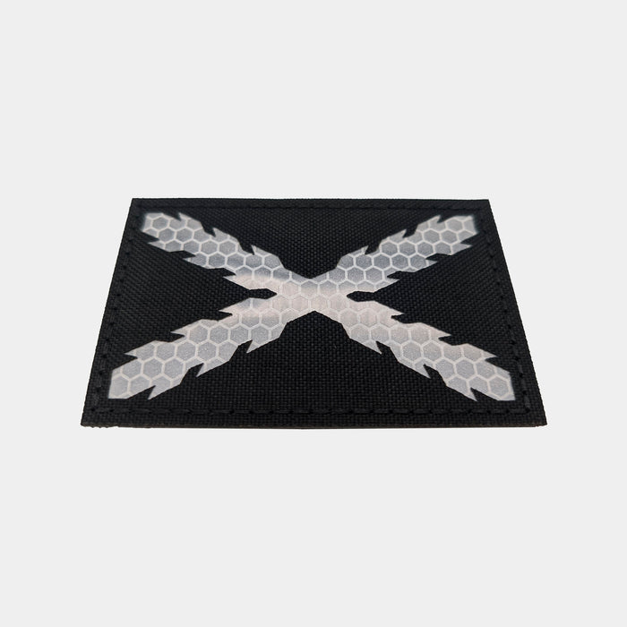 Parche del aspa de borgoña, el fondo blanco es de un tejido reflectante. La bandera del aspa de borgoña es la bandera imperial española por excelencia.