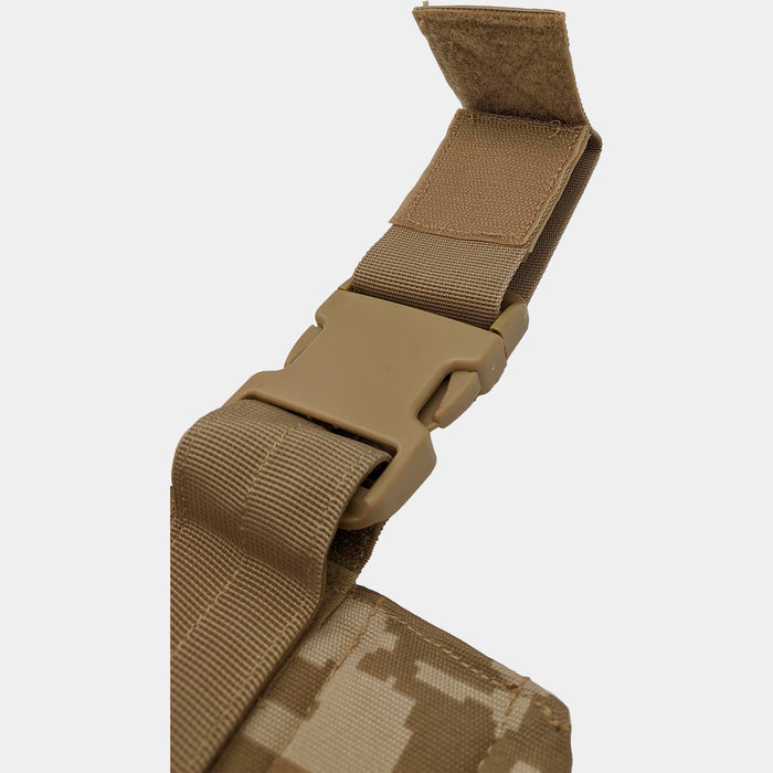 Pernera molle en camuflaje árido pixelado de la marca española Pielcu, fabricada en nylon cordura de alta resistencia. Este panel táctico con paneles de anclaje molle nos permite acocplar diferentes accesorios. Además se agarra a la pierna mediante dos correas regulables, además cada una de ellas cuenta con una parte elástica que nos permite total movilidad.