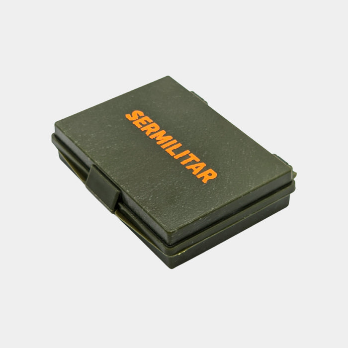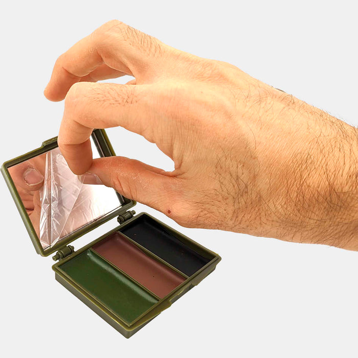 Pintura facial de camuflaje verde, marrón y negro con un pequeño espejo que facilita la aplicación. Tamaño aproximado: 6x8cm