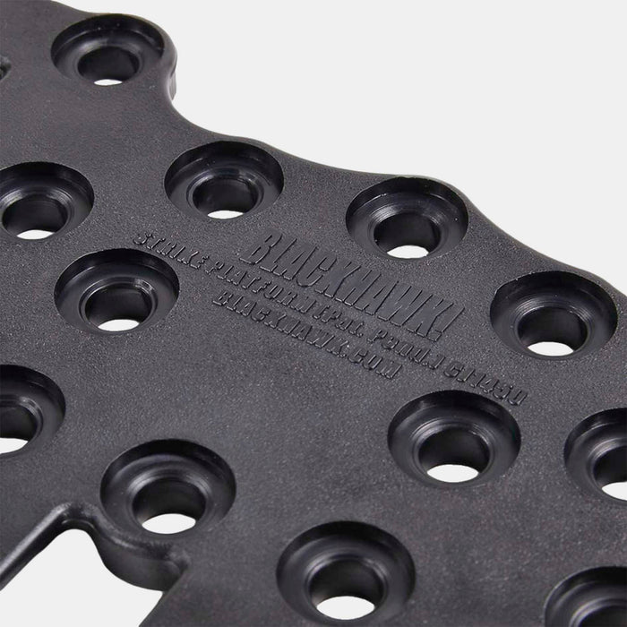 Plataforma táctica Strike de la marca BlackHawk, se puede acoplar mediante los enganches que dispone en la parte posterior a cualquier anclaje de tipo molle. Además, gracias a los agujeros que tiene, se puede acoplar mediante tornillos (incluidos) una funda de servicio en diferentes posiciones.