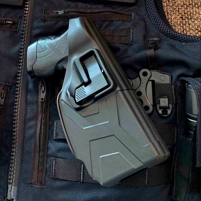 Está fabricada en polímero de alta densidad, su diseño nos permite acoplar todo tipo de accesorios, como fundas porta cargadores, porta linternas, etc.