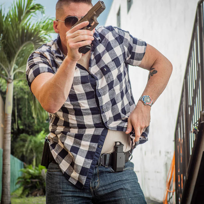 El portacargador 8MH01 de la marca italiana Vega Holster tiene un diseño abierto, perfecto para los que buscan un portacargador de fácil acceso. Cuenta con dos tornillos de presión que regulan la retención que ejerce la funda sobre el cargador.