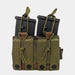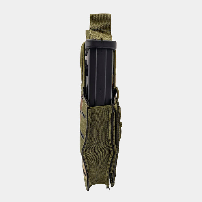 El portacargador doble de fusil boscoso pixelado de la marca española Conquer cuenta con un diseño adaptable haciéndola compatible con cartadores de la mayoría de fusiles: M4, HK G36, etc.