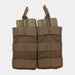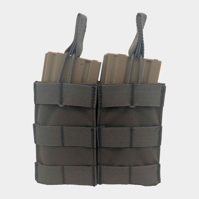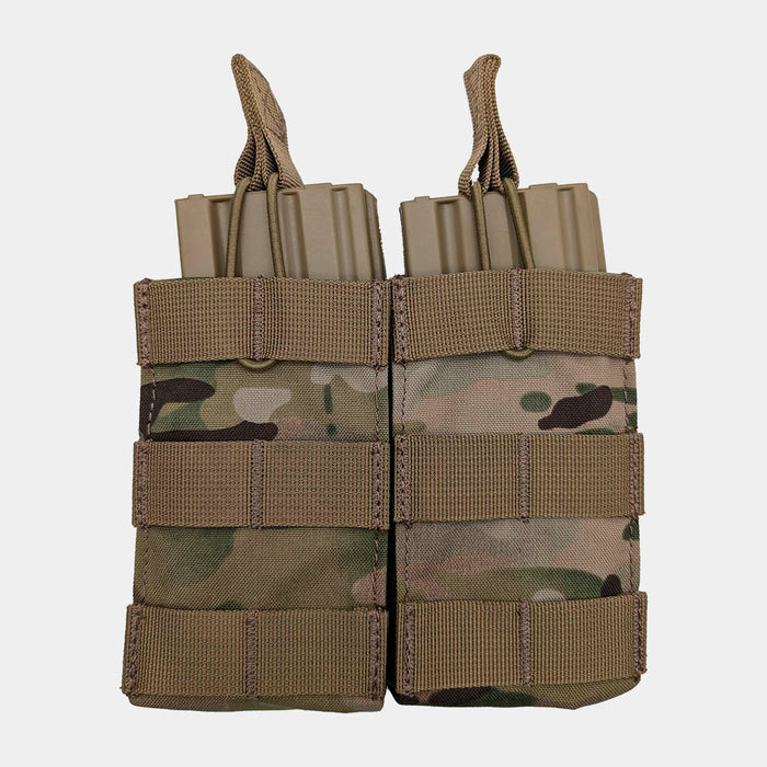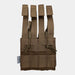 Nos permite portar dos cargadores tipo G36/M4, podemos usarlo con o sin la banda elástica de la zona superior. Se ancla facilmente a cualquier superficie molle haciendo uso de las cintas de anclaje de la parte trasera.