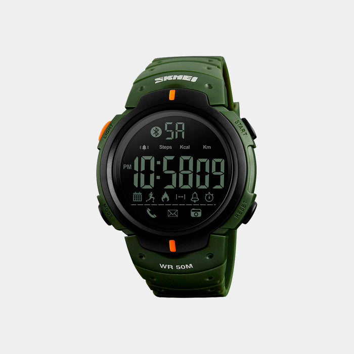 Este reloj 1301 bluetooth de la marca asiática SKMEI es un reloj con estética militar que cuenta con podómetro, contador de calorías, etc.