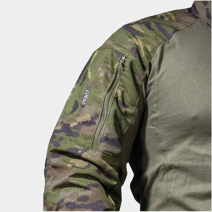 En cuanto a la camiseta táctica la parte central está fabricada en algodón y cuenta con cremallera de la marca YKK. En las mangas encontramos bolsillo con cremallera a la altura del biceps, además dispone de una zona de velcro en la parte exterior de este.